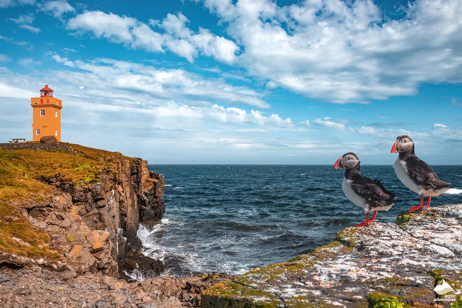 North Atlantic puffins sitting in front of orange lighthouse in Iceland