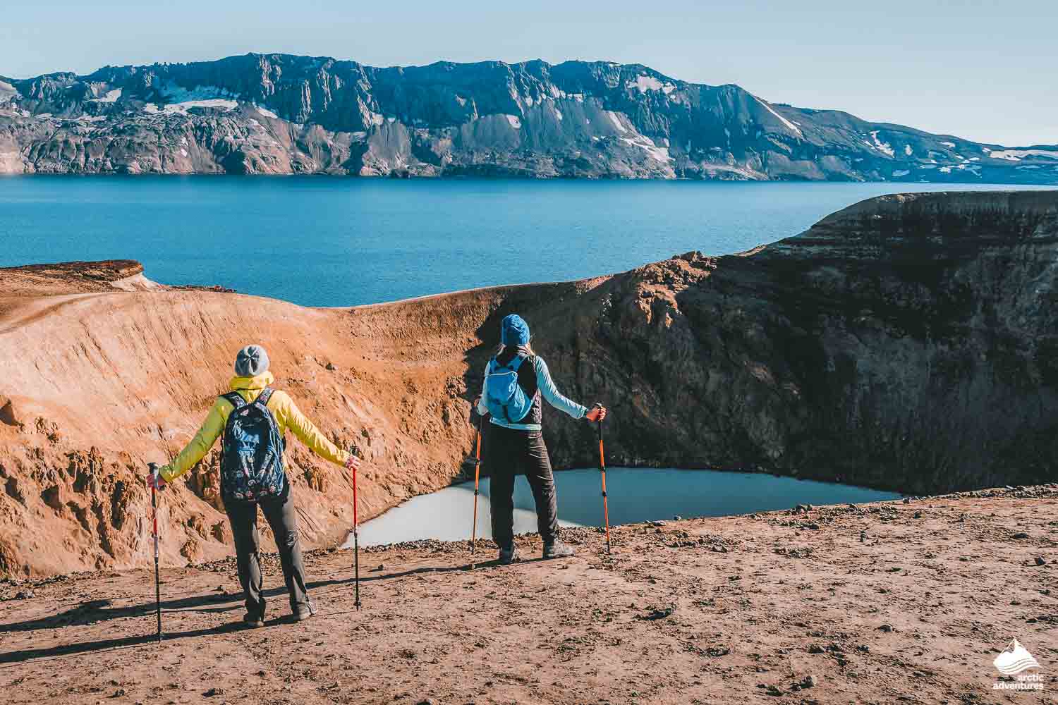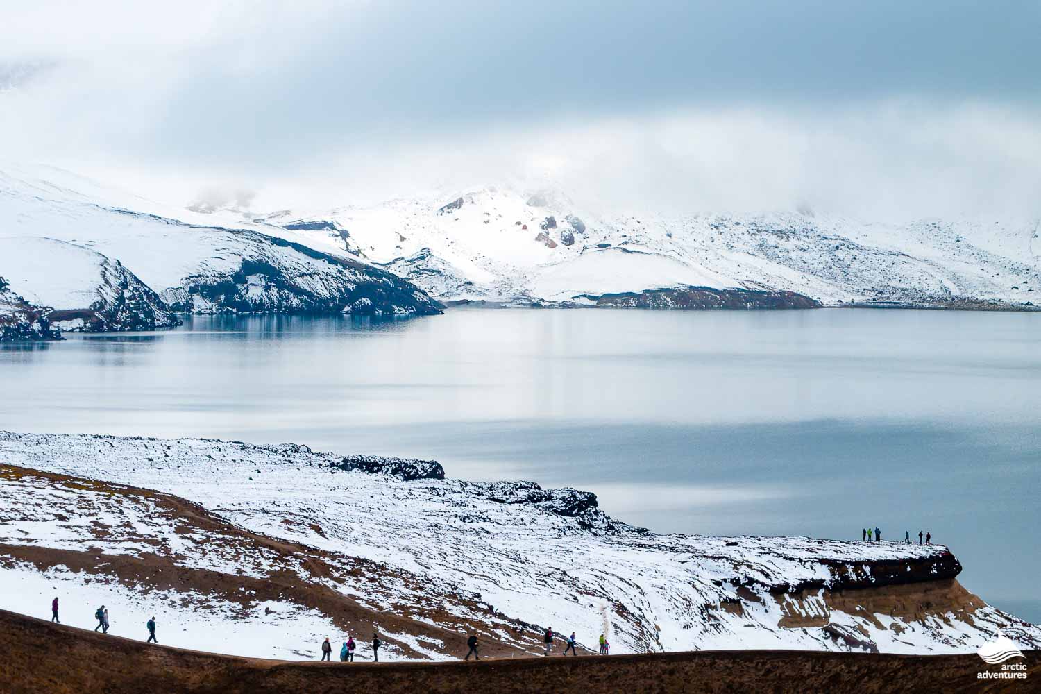 Hikers looking at Geothermal crater lake near the Askja volcano