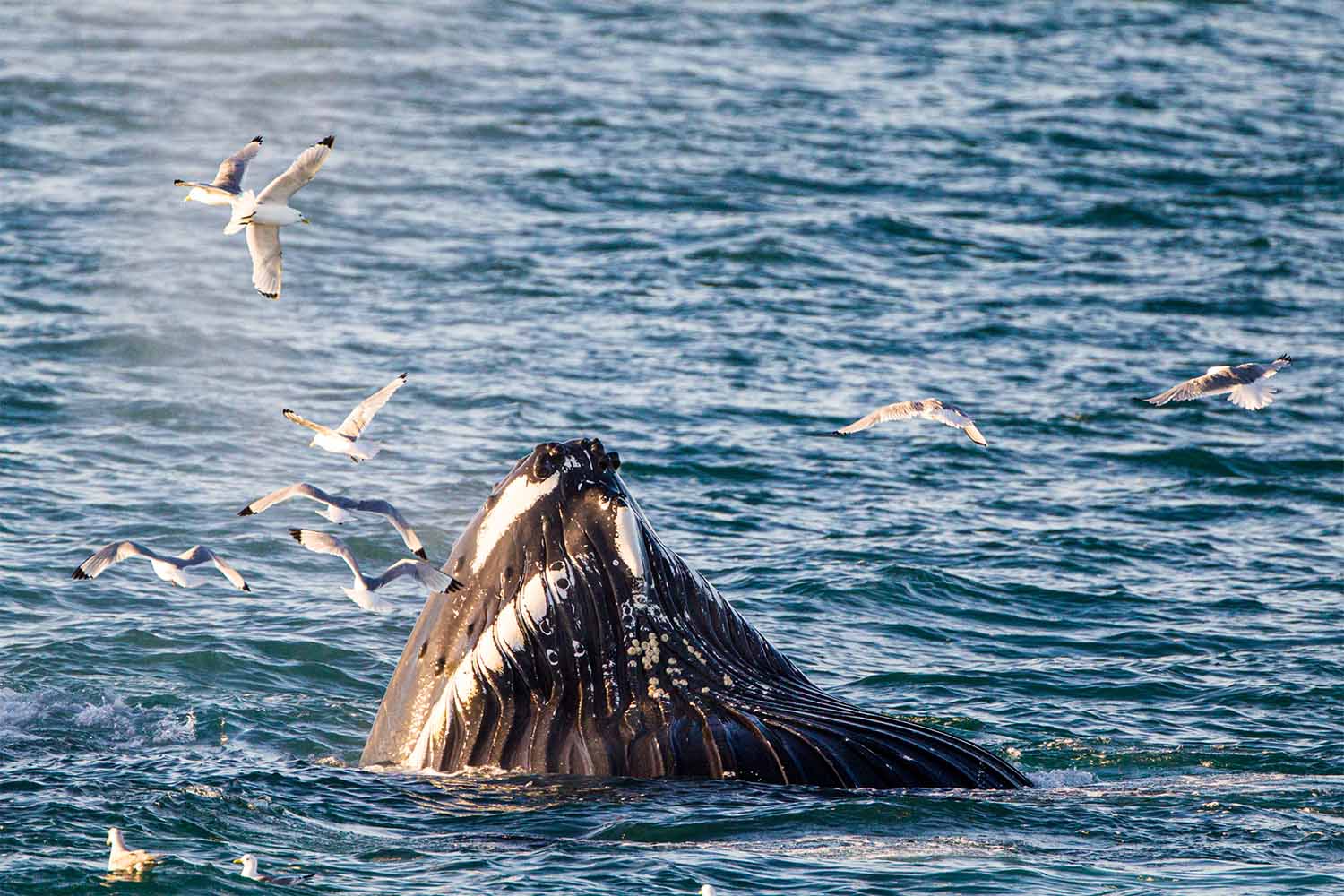 Humpback whales are well-known for their impressive acrobaticsand enchanting songs. You can spot these magnificent creatures in Icelandic waters between May and September. Humpback whales are recognized by their long pectoral fins, and they can jump out of the water, slap their tails, and make bubble netsto catch their prey! Due to their incredible behaviors, whale watchers particularly enjoy observing humpback whales.
