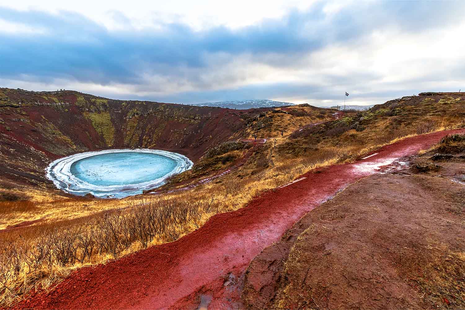 Kerið Crater: Located just off the Golden Circle route, Kerið is a stunning volcanic crater lake. Its vibrant red slopes and azure waters create a mesmerizing sight, perfect for a short hike or photo opportunity.