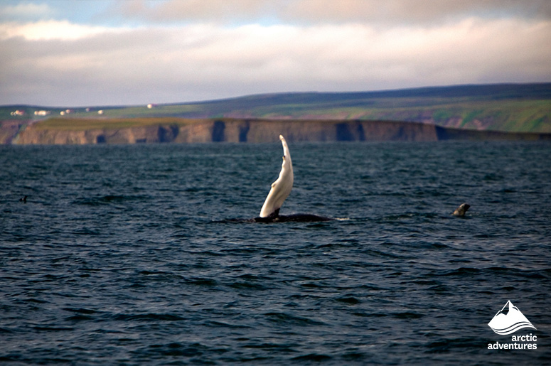 A humpback whale's long white pectoral breaching the water with the green Icelandic coastline in the background