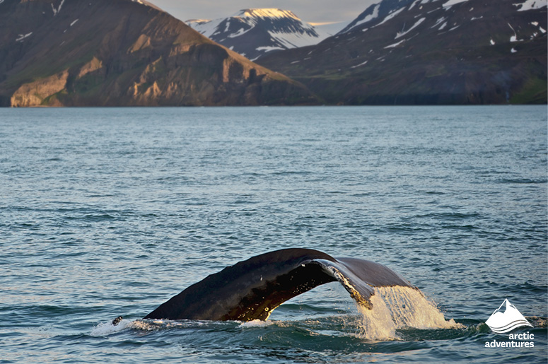 Humpback whale raising its fluke out of the water with Iceland’s mountains in the background