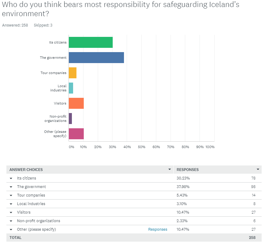 Arguably one of the more controversial findings of the survey; respondents believe that the Icelandic government bears most responsibility for the environment, followed by the country’s citizens.