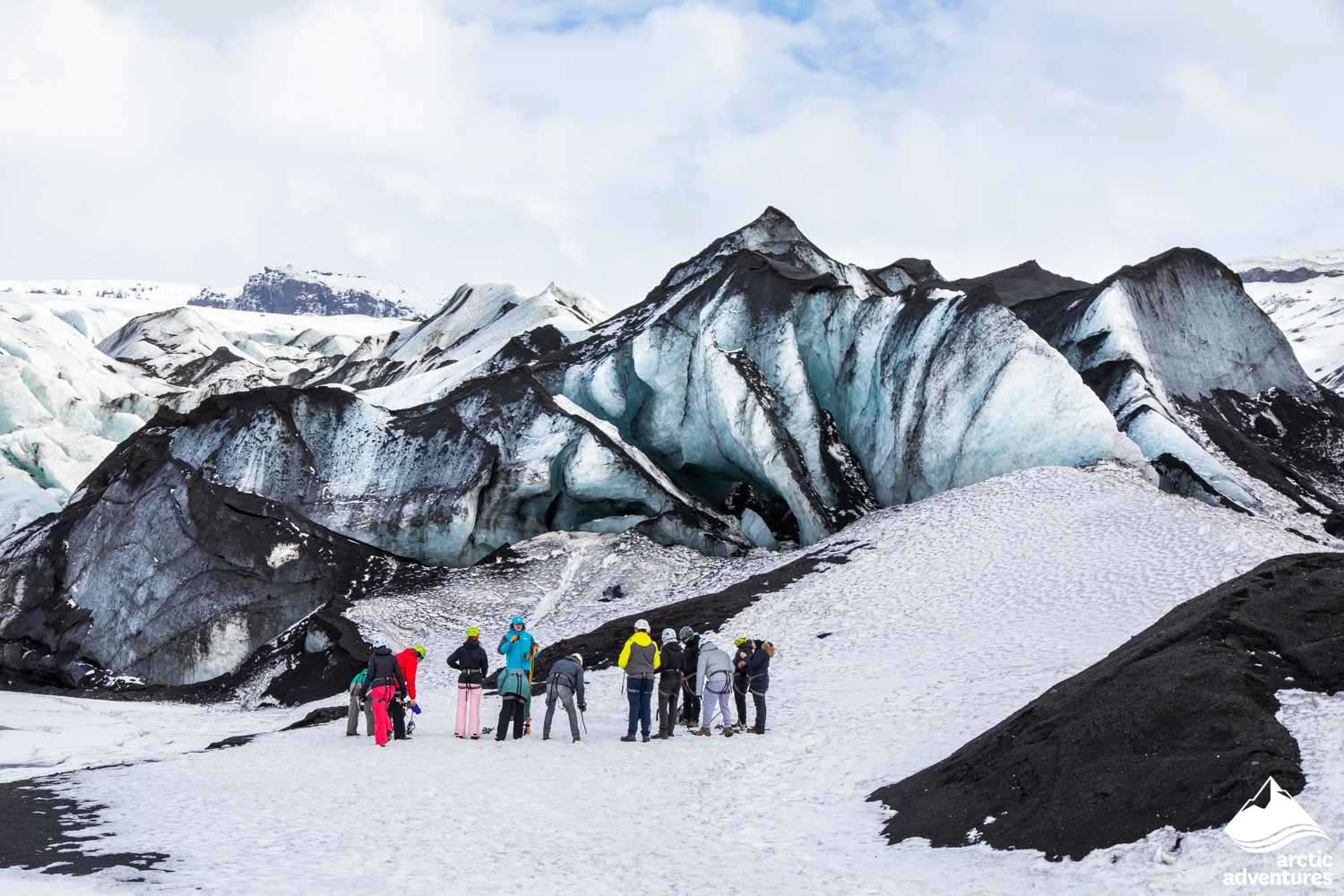 Glacier hiking on Sólheimajökull glacier covered in volcanic ash, Iceland