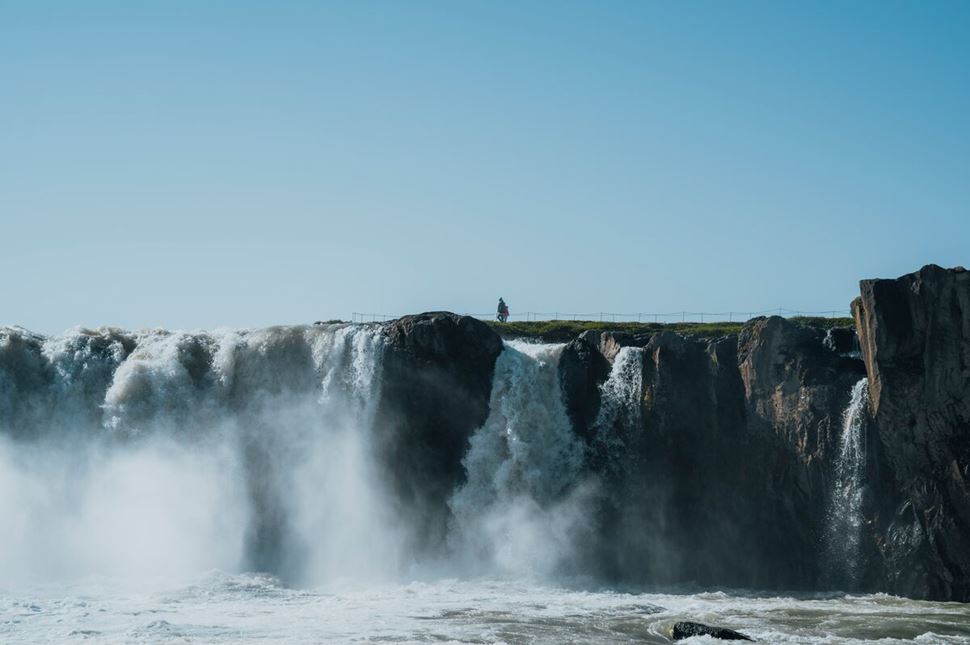 Goðafoss plunges from high cliffs, creating a misty spray. Photo by Gunnar Gaukur.