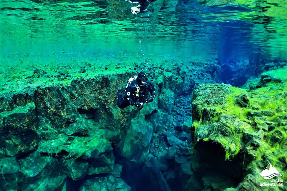 If snorkeling isn't enough of a challenge for you, consider exploring Silfra Fissure through scuba diving. Book a course and obtain your PADI license at this incredible location. Once certified, you'll be able to explore the fissure up close and venture deeper into the water. From the depths, you can get close to the rocky crater and witness the remnants that the tectonic plates left on this incredible spot. If cold temperatures concern you, our drysuit course will help you prepare properly for a dip in glacier water. Explore the crystal waters between tectonic plates on our Silfra scuba diving tour.