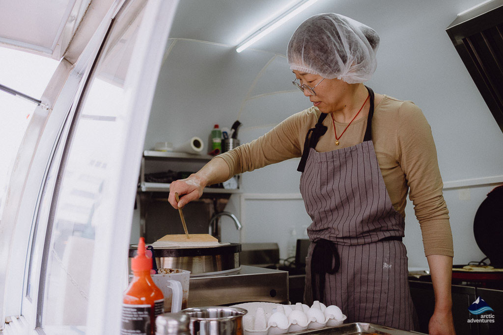 The restaurateur is from Beijing, the capital of China. After nearly two decades living in Reykjavik, she started to miss the small things about Chinese food, particularity the street eats because there isn’t any in Iceland. To ensure authenticity in terms of texture and taste, she herself makes the buns, stews the pork, skews the lamb, mixes and sautes the staffings, and wraps the dumplings. The tasks often begin in the early morning of the day before the truck is open for business.