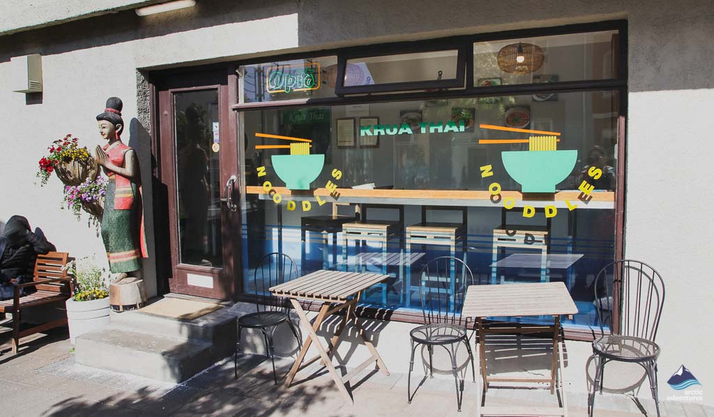 Coming down from Hallgrimskirkja church in Reykjavik on the street of Skólavörðustígur, you will pass by a beautiful storefront with a Thai lady sculpture holding a bouquet of flowers. The window belongs to the casual style Thai restaurant Krua Thai. The owner acquired this small establishment as an express service window. A few meters further down around the corner of the block is the door to the two-floored restaurant.