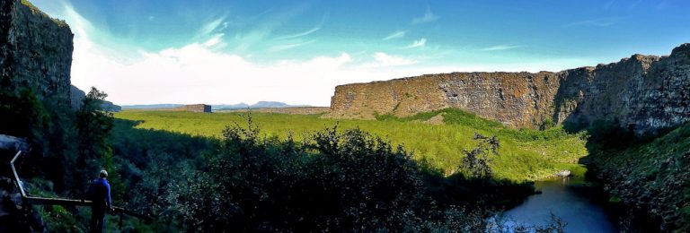 Ásbyrgi is an incredible canyon with an incredible history. It was formed by a couple of epic glacial floods, the first at the end of the ice age, with at least one other flood taking place a few thousand years later. These were no ordinary floods but truly giant versions of the Jökulhlaups (glacial runs in English), for which Iceland is famous. Giant ice dams, high on Vatnajökull glacier, ruptured unleashing monumental torrents of water carrying huge blocks of rock, debris, and ice. Enormous volumes of rock were ripped asunder, and the extraordinary horseshoe-shaped canyon of Ásbyrgi was formed. Ásbyrgi is within Vatnajökull National Park, more information about Iceland’s National Parks.