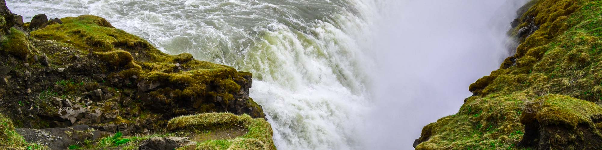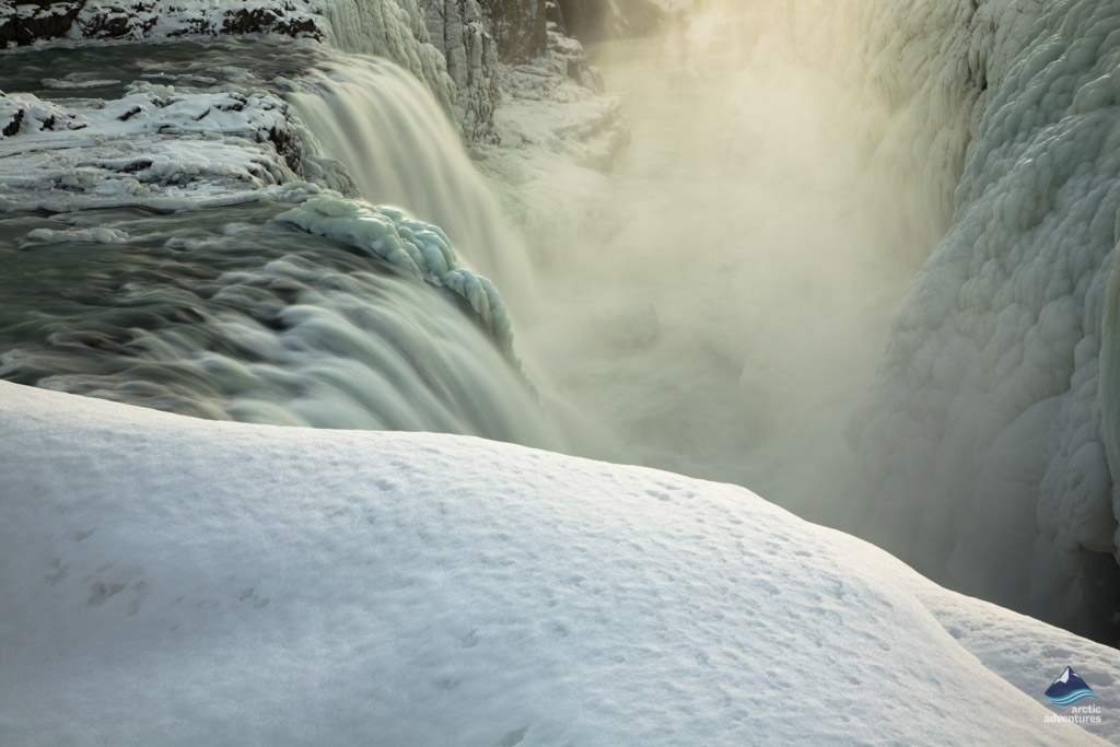 Der Gletscherfluss Hvítá (auch bekannt als der ‚weiße Fluss‘) entspringt im Langjökull, dem zweitgrößten Gletscher in ganz Island. Die durchschnittliche Durchflussrate sind atemberaubende 140 Kubikmeter pro Sekunde, diese Menge vergrößert sich im Sommer durch die Unmengen an Schmelzwasser noch einmal erheblich. Der donnernder Hvítá fällt etwa 32 Meter in zwei Stufen zu je 10 und 22 Meter in die Tiefe und verschwindet in einem zerklüfteten tiefen Gletschercanyon. Das Verschwinden des krachenden Falls in die Schlucht lässt ihn noch höher erscheinen als er ist. Es herrscht eine gewisse Rauheit, Kraft und Weite an diesem Wasserfall, wodurch viele Menschen diesen Ort in großer Ehrfurcht vor der Natur verlassen. Der rund 2,4 Kilometer lange Canyon am Gullfoss wurde durch verschiedene enorme Gletscherfluten während der letzten Eiszeit geschaffen.