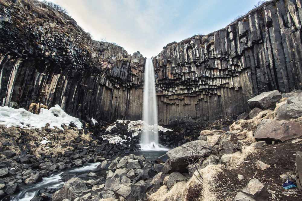 Svartifoss (schwarzer Wasserfall) in Skaftafell, ist einer der beliebtesten Wasserfälle im Vatnajökull Nationalpark. Der Name dieses Wasserfalls wurde deutlich, durch die schwarzen Basaltsäulen, die ihn umgeben, beeinflusst. Teile dieser unterschiedlich langen Basaltsäulen hängen vom Kliff herab, an dem der Wasserfall 25 Meter in die Tiefe stürzt. Der Grund des Wasserfalls ist umgeben von gefallenen Steinen und hexagonalen Säulen, die dafür bekannt sind herunterzufallen. Architekten benutzten oft die Umgebung vom Svartifoss als Inspiration. Der Einfluss ist deutlich in der evangelischen Kirche Hallgrímskirkja in Reykjavik zu sehen. Dennoch zeigte der Architekt, Guðjón Samúelsson, Humor, indem er im Kontrast zu schwarzen Wasserfall, die Kirche komplett weiß gestaltete.