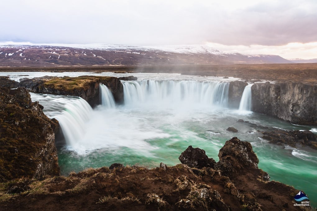 Dies ist ein wunderschöner weiter Wasserfall in Nordisland. oder der Wasserfall der Götter ist ein Muss, wenn Sie den Norden Islands erkunden.