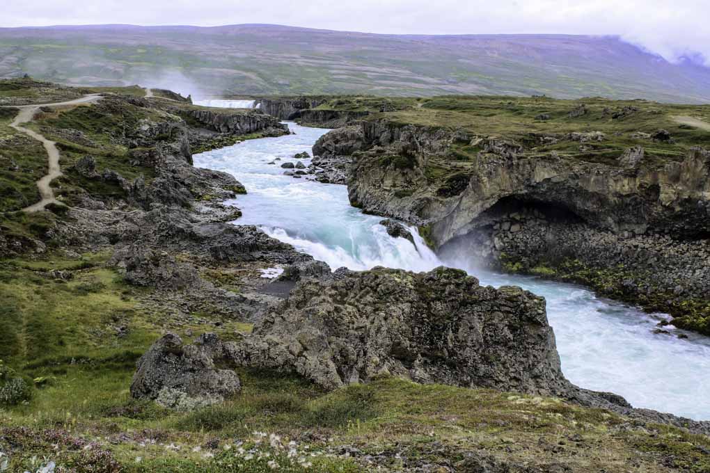 Goðafoss ist einer von Islands wahren Schätzen und einer der größten Wasserfälle Islands.Er wird durch den Fluss Skjálfandafljót gespeist, der durch ein 7000 Jahre altes Lavafeld vom Trölladyngja Vulkan fließt, tröll bedeutet Troll in Deutsch, die Gegend hat also definitiv ein gewissen Mysterium und ist inspiration für viele Legenden.