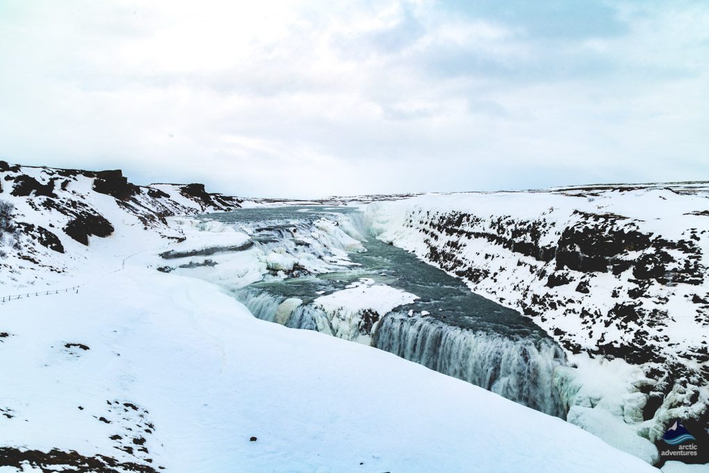 Ungefähr einen Kilometer über dem Gullfoss-Wasserfall macht der Hvítá-Fluss eine scharfe Kurve nach rechts und fließt dann eine extrem weite, dreigeschössige und kurvige Schlucht hindurch, die dann abrupt in einem doppelgeschossigen Tal endet, in dem sich der richtige Wasserfall befindet. Die erste Stufe ist 11 Meter hoch und die zweite 21 Meter, was den Wasserfall extrem eindrucksvoll macht. Das durchschnittliche Volumen des hindurch fließenden Wassers beträgt 140 Kubikmeter pro Sekunde im Sommer und 80 Kubikmeter pro Sekunde im Winter. Die größte Flut, die jemals gemessen wurde, betrug 2.000 Kubikmeter pro Sekunde.