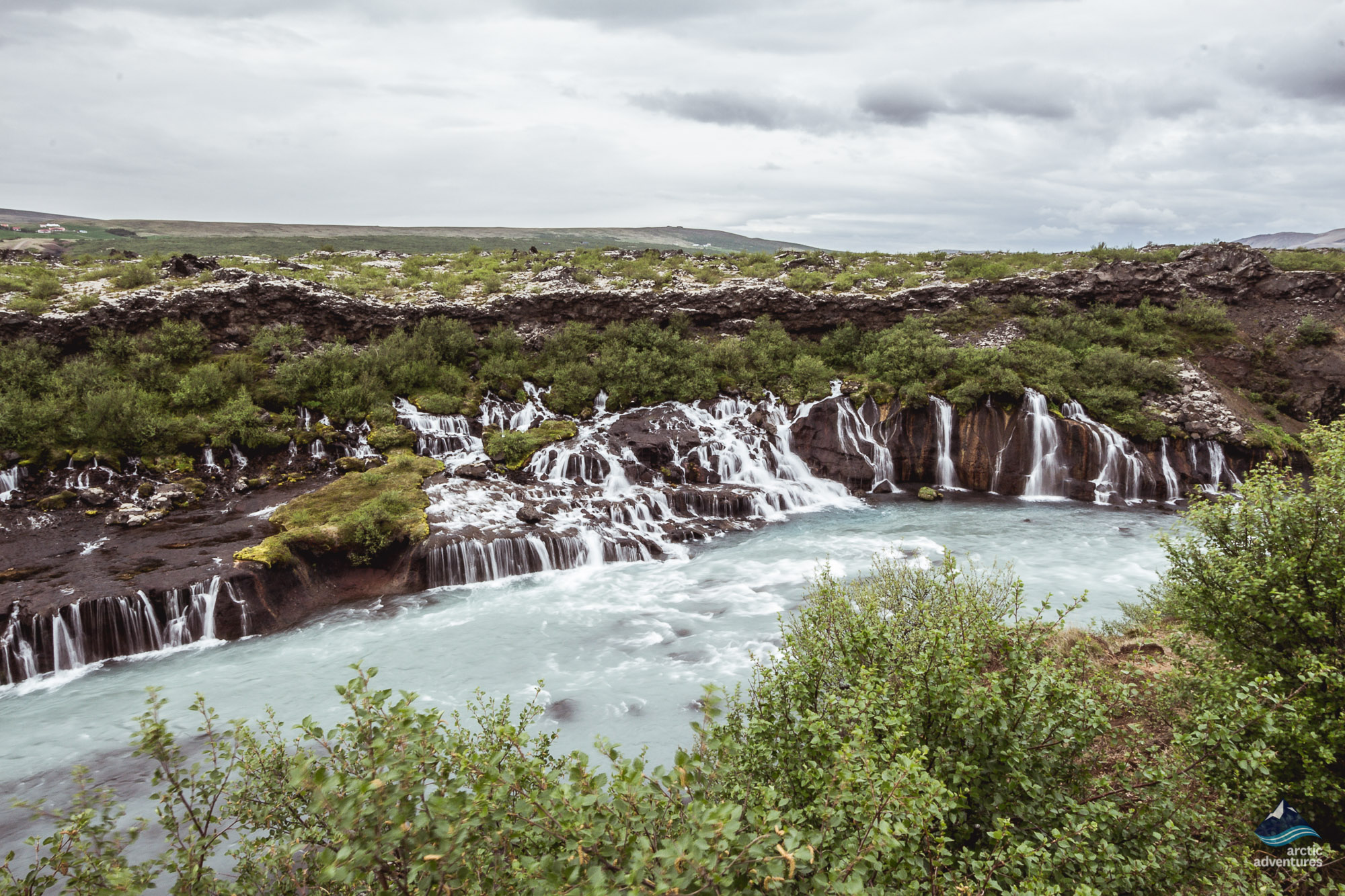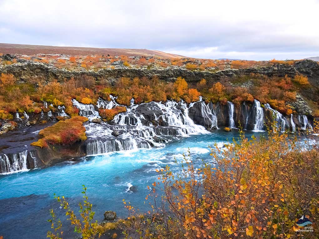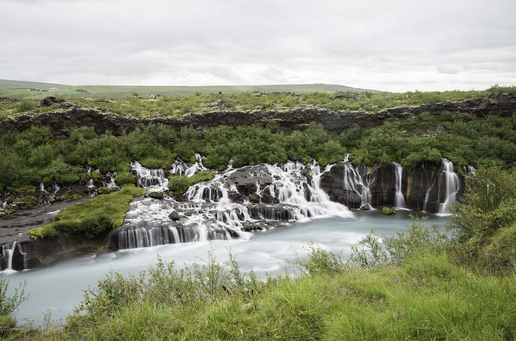 Die Wasserfälle Hraunfossar fallen das Lavafeld von Hallmundarhraun herunter und münden in den Hvítá-Fluss in Borgarfjörður. Sie werden oft als einige der schönsten Wasserfälle Islands gelistet. Das unfassbar blaue Wasser kommt direkt aus dem Langjökull Gletscher, dem zweit größten Gletscher Islands. Der Wasserfall ist ein Muss, wenn Sie den Borgarfjörður und den Silbernen Kreis besuchen.
