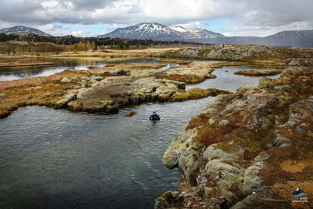 Such outstanding visibility is further enhanced by the all-year-round low water temperatures that are between 2-4 °C (35 to 39°F) because the natural spring travels underground and does not freeze at its source, it’s able to maintain a constant temperature range. Furthermore, when the pure natural spring flows into Silfra, it’s strong enough to create a gentle current that keeps the water from being static. It’s another major reason for Silfra to have such excellent visibility since the flowing clear water never becomes dirty. The gentle force of the current is helpful for snorkeling at Silfra, too. It makes a meditation-like, effortless snorkeling experience in which you can rest on the water while the slight current takes you to its natural course along the fissure. These amazing factors together make Silfra Fissure an unrivaled snorkeling and diving location in the world.