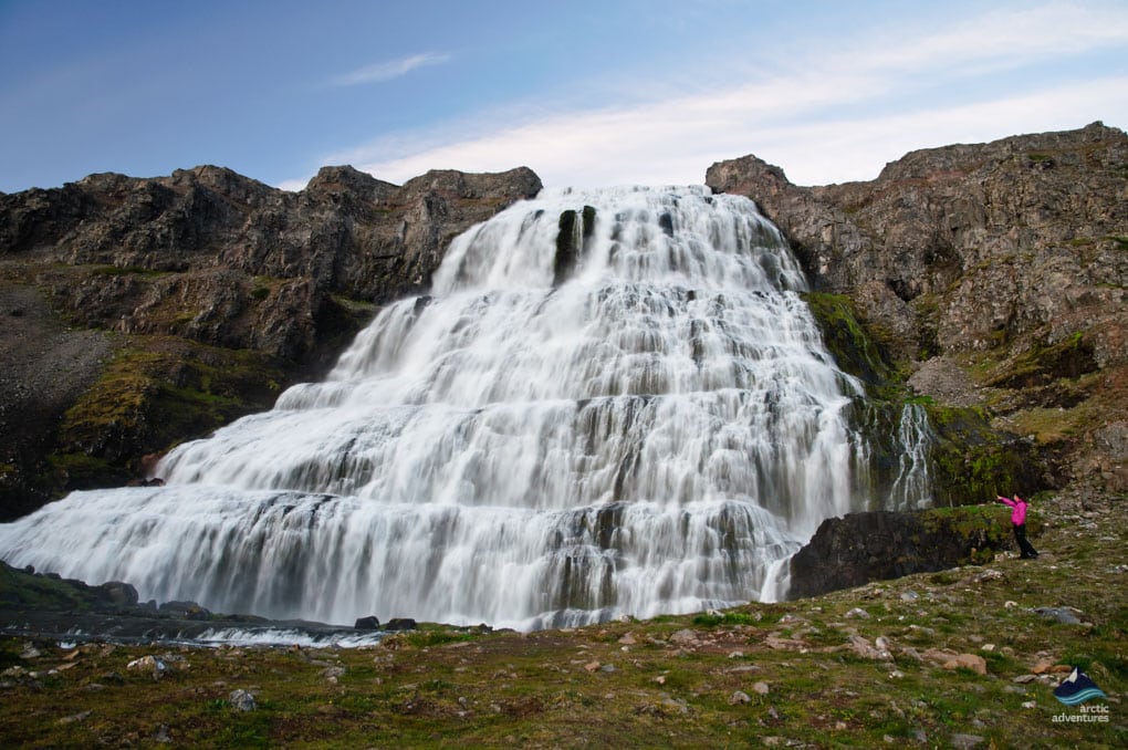 Der verblüffende Dynjandi, der Juwel der Westfjorde, besitzt eine außergewöhnliche Breite, die von 30 Metern an der Spitze bis zu 60 Metern am Boden misst. Wie man zu Dynjandi gelangt: Es muss eine kleine Strecke gewandert werden, um Dynjandi zu erreichen, was etwa 15 Minuten dauert. Während der Wanderung werden Sie von anderen kleineren Wasserfällen wir Strompgljúfrafoss, Hæstahjallafoss, Göngumannafoss, Hrísvaðsfoss, Kvíslarfoss, Hundafoss und Bæjarfoss begrüßt. Im Jahre 1996 errichteten Freiwillige einen steinigen Pfad, um zum Wasserfall zu gelangen, Sie müssen aber dennoch etwas klettern, um an die Spitze des Wasserfalls zu gelangen, was für Menschen mit Knieproblemen sehr schwierig sein kann, aber dennoch keine große Herausforderung ist.