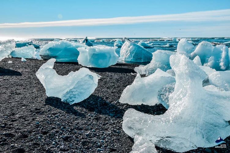 Nach diesem spannenden Abenteuer ist es Zeit, um sich etwas abzukühlen. Was kommt also gelegener als der Genuss des Anblicks einer Gletscherlagune? Die mehrfarbigen Eisberge und -blöcke schwimmen in der riesigen Lagune umher, die sich direkt an der Ringstraße 1 befindet. Sie können dort leicht an ihrem Strand spazieren gehen, um das Bild der Lagune aus verschiedenen Blickwinkeln zu genießen. Die Eisberge brechen vom Breiðamerkurjökull-Gletscher ab und stürzen in die Lagune, wo sie anschließend schmelzen und am tiefschwarzen Vulkanstrand mit dem Namen Breiðarmerkursandur an Land gespült werden. Während die Eisberge dort auf dem Sand liegen, glitzern sie wie Diamanten in der Sonne, was dem Strand den Namen Diamant-Strand verlieh. Ein Muss bei einem Besuch der Gletscherlagune Jökulsárlón!