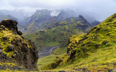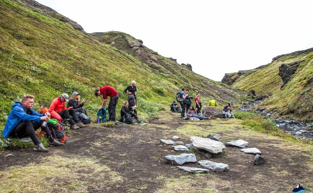 Unser letzter Tag im isländischen Hochland führt uns in das berühmte Thorsmörk Tal, eine gloreiche Oase auf grün, direkt zwischen zwei riesigen Gletschern gelegen. Wir beginnen unsere Wanderung nahe des großen Myrdalsjokull Gletscher, der wie eine endlose Masse aus weißem Schnee am Horizont wirkt. Wir kommen vorbei am einmalig aussehenden Einhyrningur (das Einhorn), einem merkwürdigen Berg, der seinen Namen von der ähnlich aussehenden legendären Kreatur hat.
