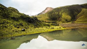Wenn wir uns unserer Unterkunft nähern am See Alftavatn, passieren wir die grüne Oasis, die durch den Fluss Grashagakvisl entstanden ist, der einen hellen Kontrast zu der sonst eher dunklen Landschaft bietet. Wir müssen einen kleinen Bach überqueren, bevor wir den Abend am See Alftavatn ausklingen lassen.