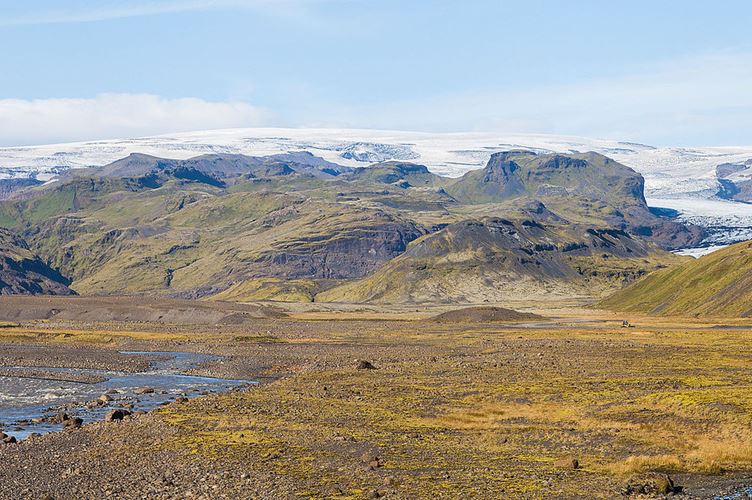 Wir beginnen damit einen weiteren Fluss zu durchqueren und gehen weiter Richtung Mælifellssandur und in das Vulkanland. Wir passieren die Vulkane Stórasúla und Hattafell auf unserer Reise nach Emstrur. Mit etwas Glück und an einem klaren Tag haben Sie die Chance auf unglaubliche Aussichten auf die berühmten Vulkangletscher Mýrdalsjökull und Eyjafjallajökull. Diese Zwillinge haben schon oft an die großartige Kraft der Natur erinnert. Eyjafjallajökull ist der Vulkan, der 2010 Vulkanasche bis zu einen Kilometer in die Luft gesprüht hat und den kompletten Flugverkehr in Europa lahmgelegt hat. Unter Mýrdalsjökull liegt der gefürchtete Vulkan Katla. Auf unserem Weg nach Botnar, einer grünen Oase inmitten der schwarzen Sandwüste sehen wir Markarfljótsgljúfur, einen wunderschönen 200 Meter tiefer Canyon, der durch einen früheren Gletscherfluss geformt wurde. Unsere Berghütte und unser Campingplatz befinden sich in diesem Bereich.