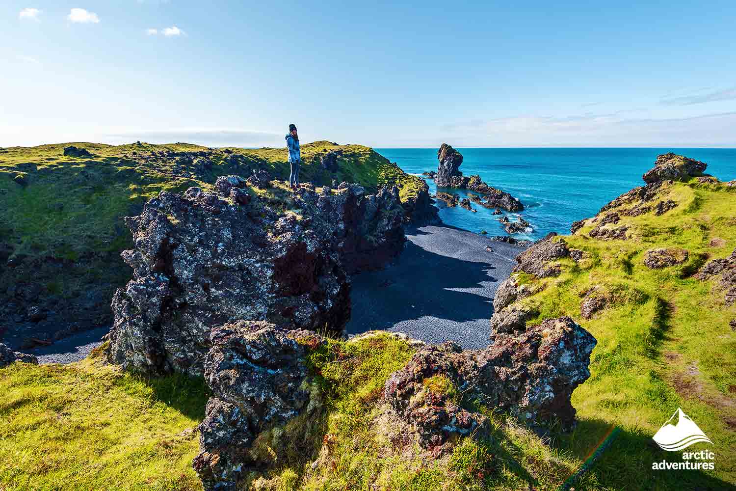 Als nächstes besuchen Sie Búðir, einen malerischen Weiler, umgeben von der atemberaubenden Landschaft der Halbinsel Snæfellsnes. Ihre Reise führt Sie dann nach Arnarstapi, einem Fischerdorf, das für seinen beeindruckenden erodierten Steinbogen Gatklettur bekannt ist. Hier legen Sie eine herrliche Mittagspause ein.