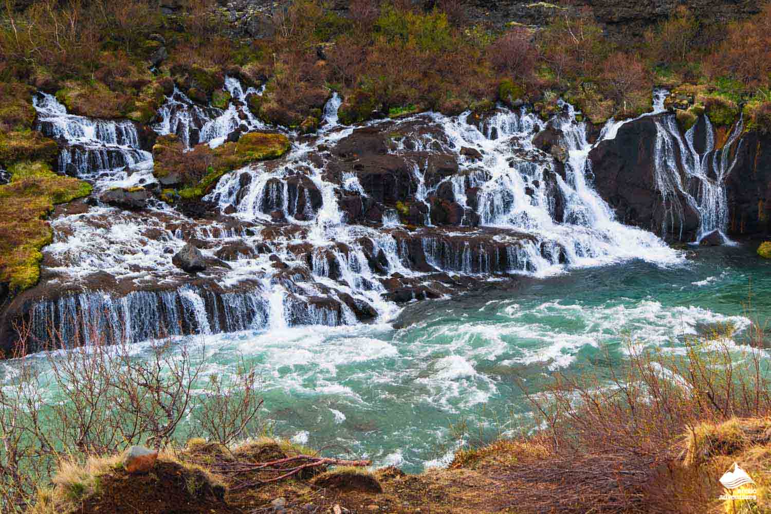 Auf dem Programm steht ein Stopp an den Wasserfällen Hraunfossar und Barnafoss. Hraunfossar („die Lava-Wasserfälle“) ist eine riesige Ansammlung kleinerer Wasserfälle, die durch die Risse von Lavaformationen stürzen. Barnafoss („Wasserfall der Kinder“) ist einer Volkslegende zufolge der Ort, an dem einst zwei Kinder auf tragische Weise ertranken.