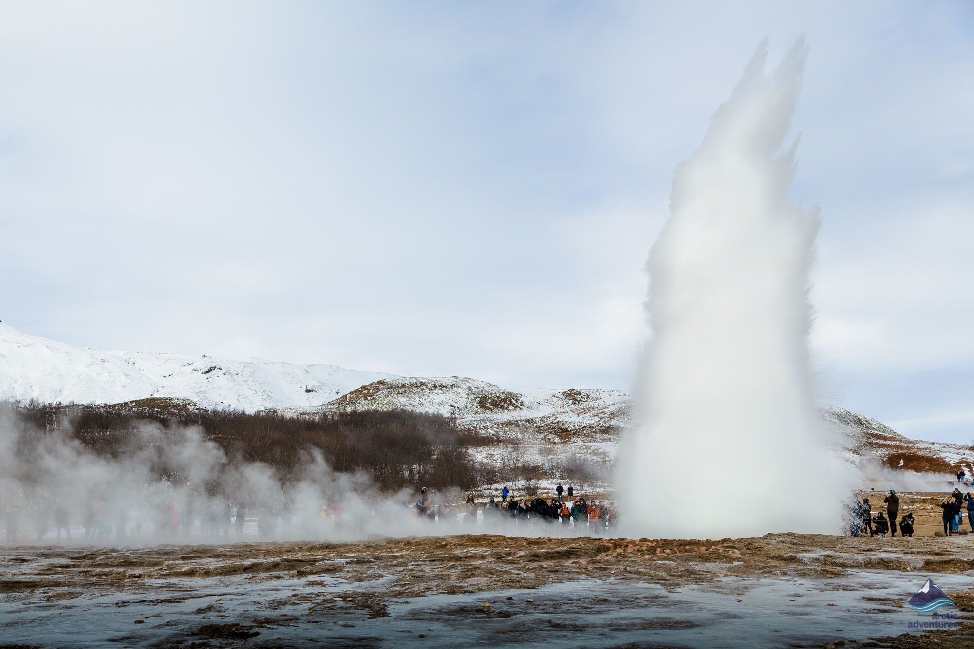 Anschließend werden Sie die legendäre Gegend von Geysir besuchen, wo es einige Geysire gibt, die etwa alle fünf Minuten kochend heiße Wasserströme in die Luft befördern. Der berühmteste von ihnen ist als Strokkur bekannt, die Gegend beherbergt aber auch den inzwischen ruhenden Großen Geysir, der allen anderen Geysiren seinen Namen gab.