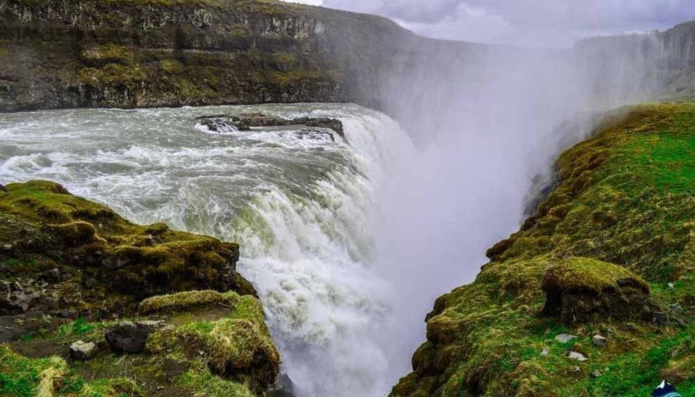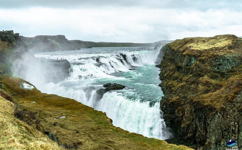 Der finale Halt der Tour ist der fantastische Gullfoss-Wasserfall (‚goldene Fälle‘), wo rauschende Ströme fallenden Wassers über drei Stufen aus Lavagestein fallen, hinein in das verführerisch grüne Tal darunter. Der Wasserfall erhielt seinen Namen wegen des goldenen Schimmers, den das Wasser während des Hinabfallens über die Felsen annimmt. Besucher mit besonders viel Glück können sogar einen deutlichen Regenbogen sehen, der dem ohnehin schon wunderschönen Anblick Farbe verleiht.