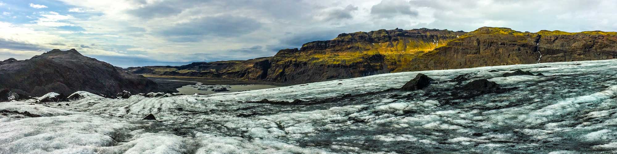 Das Zuhause des Sonnengletschers – ein Gletscherwanderparadies direkt an der Ringstraße in Südisland. Er ist etwa 8 km lang und zwischen 1 bis 2 km breit. Dieser Kracher ist einer der am meisten besuchten Gletscher in Island und befindet sich nur zwei bis zweieinhalb Stunden von Reykjavík entfernt. Während der vergangenen Jahre erhielt er den Spitznamen „schrumpfender Gletscher“, da sein Wandel sehr offensichtlich ist. Der Gletscher wurde während der letzten Jahrzehnte pro Jahr um rund 65 Meter kleiner und manche Menschen glauben, dass er schon bald nicht mehr existieren wird. Sogar das Weiße Haus nutzte Fotos des Sólheimajökulls, um auf den dringenden Handlungsbedarf bezüglich des Klimawandels aufmerksam zu machen.