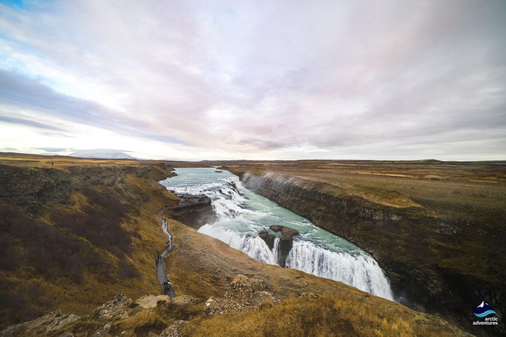 Unser dritter und letzter Tageshalt für den Tag ist Gullfoss (übersetzt ‚goldener Wasserfall‘), der ungeschlagenen Königin der isländischen Wasserfälle. Gullfoss ist wirklich ein großer Anblick, da das Wasser drei Stufen aus Lavaschichten herunterfällt und dabei seine atemberaubende Kraft und Anmut zeigt.