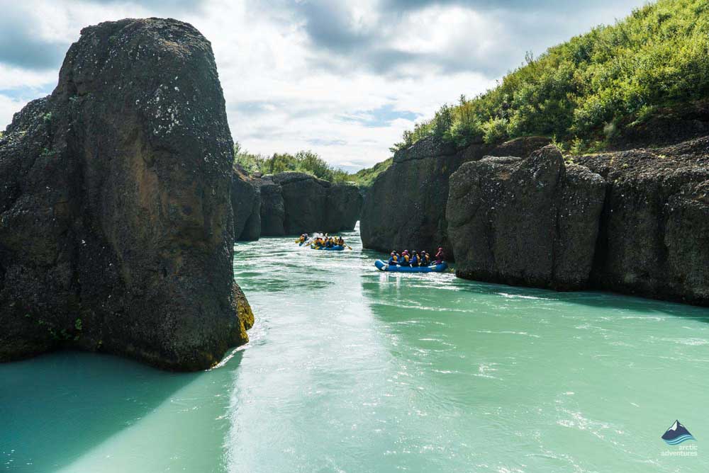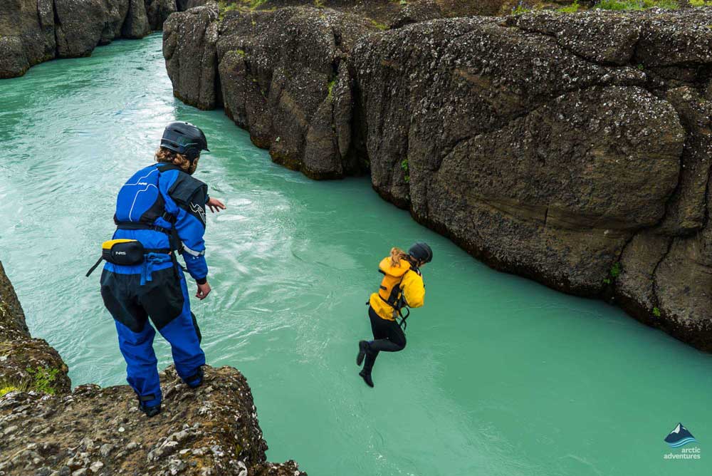 Wir beginnen eine malerische und spannende Wildwassertour entlang der Gullfoss-Schlucht. Der Fluss verfügt über eine perfekte Mischung aus wunderschönen steilen Canyons und adrenalingeladenen Wellen und Stromschnellen. Auf dem Weg passieren wir die Schlucht von Brúarhlöð (Bruarhlod), wo alle Teilnehmer die Möglichkeit haben, von einer Klippe in den Fluss zu springen. Danach können Sie eine heiße Dusche genießen und in die Sauna der Wildwasserstation gehen.