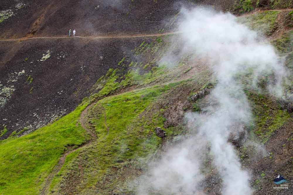 Dampf steigt von einer geothermalen Stelle in der Mitte eines Gletschers auf. Schwarze Lavaflüsse erstrecken sich über die kunterbunte Landschaft. Ein lebendig grüner Berg sticht aus einer schwarzen Wüste. Heiße Quellen blubbern in einem Schneefeld.