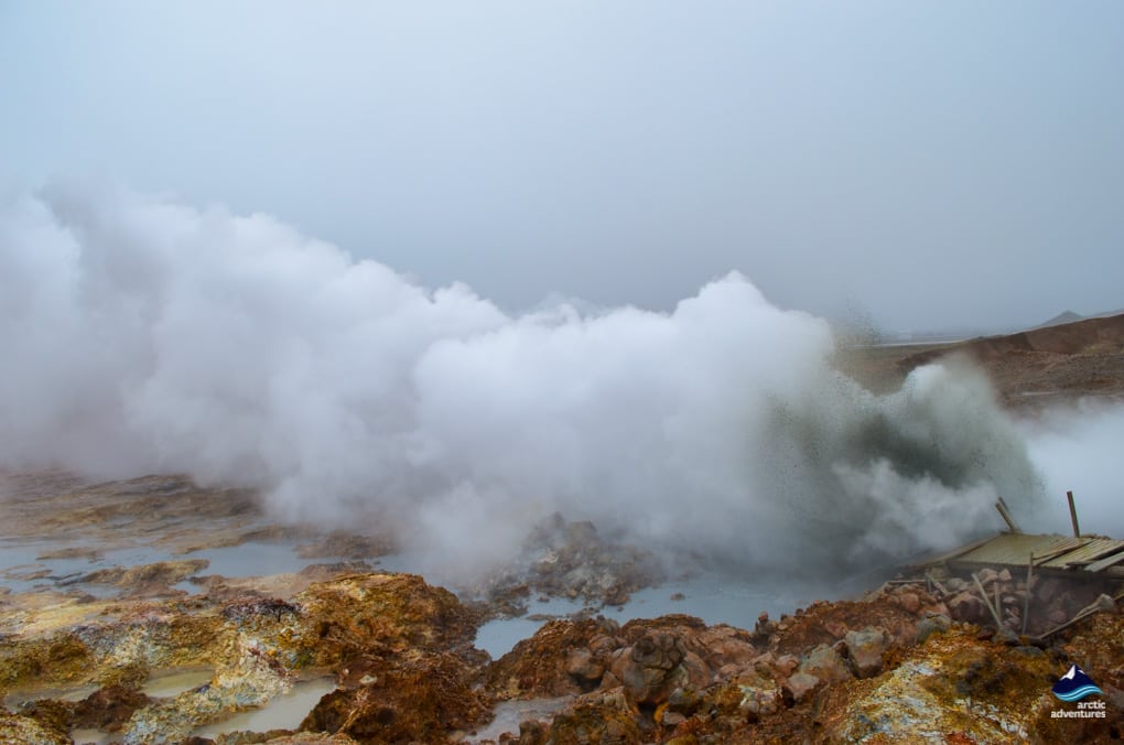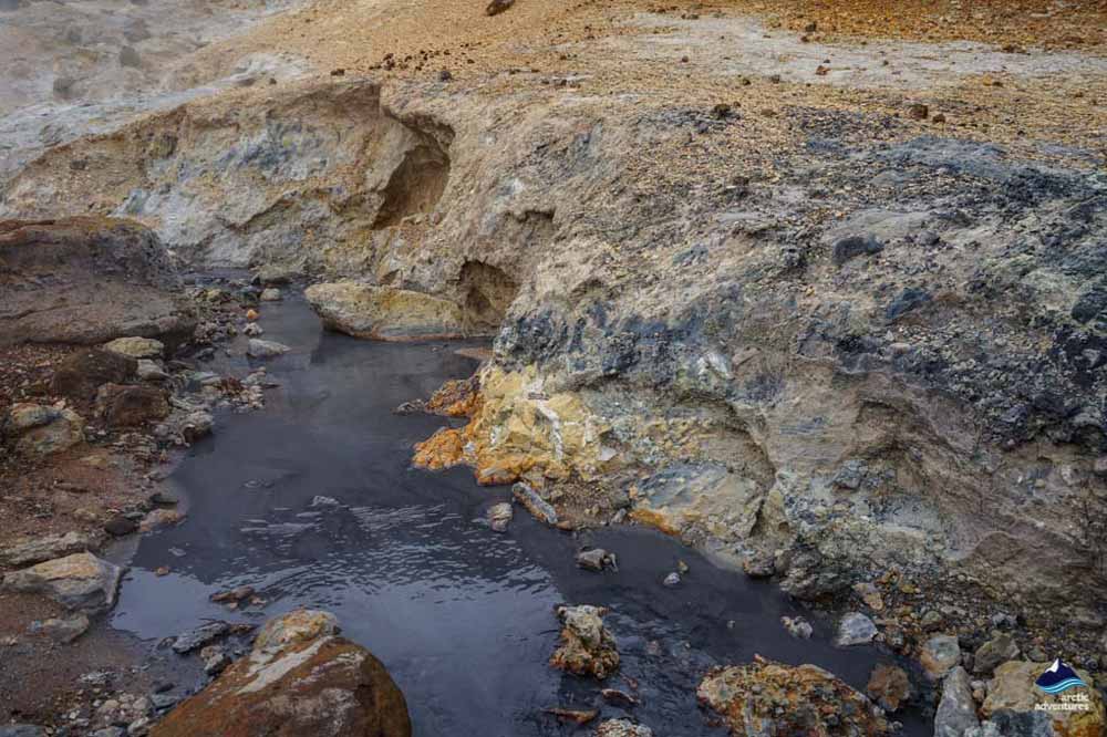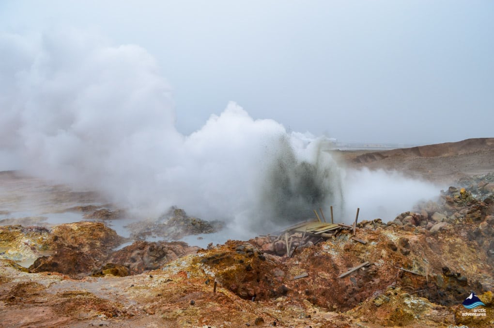 Im Verlauf des Tages werden Sie viel über Geologie und geothermale Kraft lernen! Als nächstes steht die Geothermalregion Gunnuhver auf der Liste und Spoileralarm: diese ist nicht weniger beeindruckend. Die hochaktive geothermale Region voller Schlammgruben und Dampffahnen steht in Verbindung mit einer Geistergeschichte. Deren Namen stammt von dem bösen Geist Gudrun ab, dessen Seele von einem Priester für 400 Jahre in den heißen Quellen eingeschlossen wurde. Im Übrigen hat Gunnuhver die größten Schlammgruben in Island, welche 20 Meter (65 Fuß) weit reichen. Die heißen Quellen sind anders als andere in geothermalen Gebieten um Island, denn Sie sind mit Meerwasser gefüllt, und liefern Wasser von bis zu 300°C (570°F).