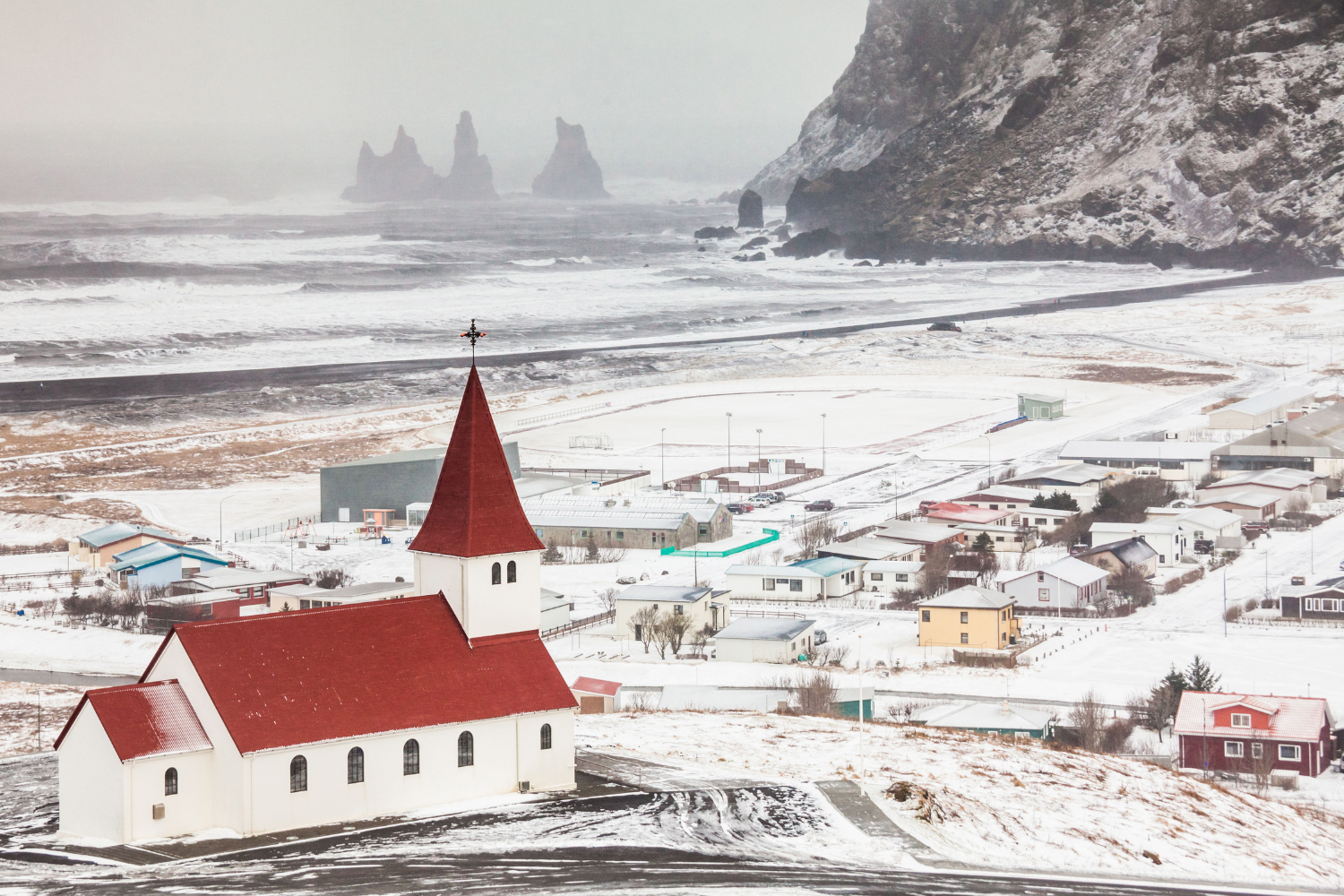 Mit 300 Einwohnern ist Vík í Mýrdal, Islands südlichstes Dorf, die geschäftigste Siedlung in einem 150 km langen Gebiet an der Südküste. Dieser lebendige kleine Ort ist ein typisches isländisches Dorf auf dem Land mit farbenfrohen Häusern, malerischen Aussichten und einer winzigen Kirche auf einem Hügel.