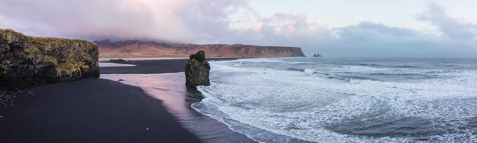 Der schwarze Sandstrand Reynisfjara ist ein weiteres Muss bei einem Besuch der Südküste. Dies ist ein vulkanischer Sandstrand mit starken Wellen, wunderschönen Basaltsäulen und Steinspitzen im Ozean. Dort gibt es ebenfalls eine Höhle im Berg Reynisfjall, die sich über dem Strand erhebt. All diese Dinge kreieren einen äußerst epischen Anblick.