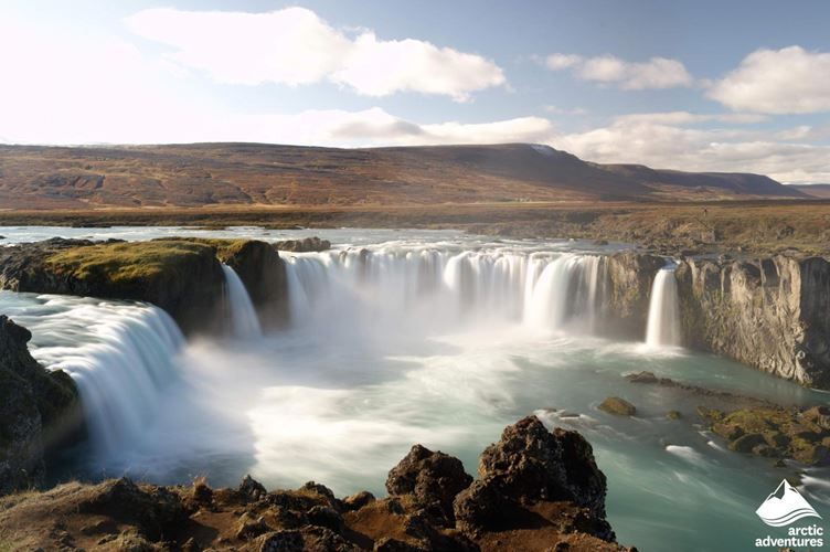 Nous continuons notre route autour du pittoresque lac Mývatn en direction d'Akureyri, en faisant un arrêt à la magnifique cascade de Goðafoss, connue sous le nom de « cascade des dieux ». Il mesure environ 30 m de large, a la forme d'un fer à cheval et contient une histoire particulière datant de l'an 1000 après JC, lorsque des idoles païennes ont été jetées dans les chutes comme un acte symbolique.
