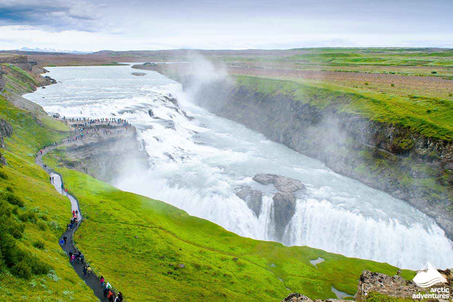 Le champ géothermique actif des sources chaudes de Geysir est une autre curiosité du cercle d’Or. Le Grand Geysir, dont l’origine du mot anglais geyser provient pour décrire ce genre de source chaude, n’est plus actif. Strokkur, une source chaude voisine, jaillit un torrent spectaculaire d’eau surchauffée, à intervalles de 5 à 10 minutes. Une escale à la chute d’eau de Gullfoss complètera notre Cercle d’Or, sentez alors la force à laquelle l’eau de la chute déferle, en 2 temps sur 32 m, au fond de ce haut canyon accidenté.