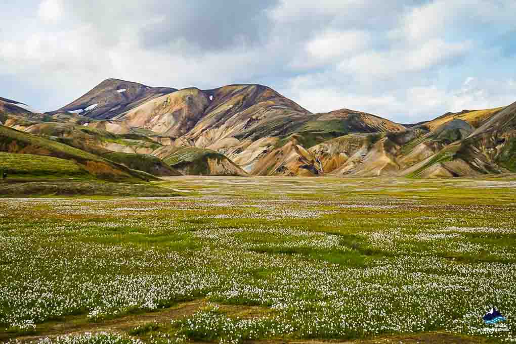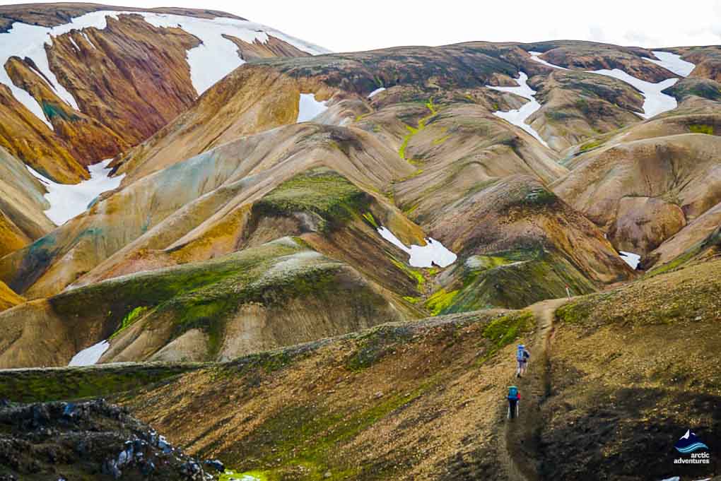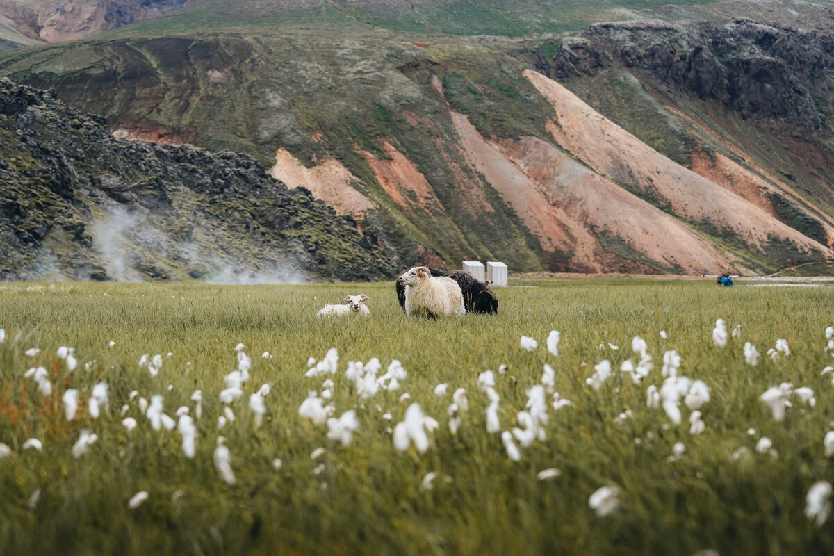 Aujourd’hui, nous marcherons jusqu’à Suðurnámur, un sommet montagneux vieux de 200 000 ans qui est très riche en minéraux rhyolitiques. En montant vers le sommet de Suðurnamur, vous profiterez de nombreux ravins et d’une vue sur les sommets colorés de la région : des montagnes douces et sablonneuses contrastant avec des verts verdoyants, des bleus, des dorures profondes et parfois des rouges vifs. Nous arriverons à Kirkjufell (différent du Mont de Snaefellsnes), un sommet escarpé de 964 m de haut avec peu de végétation, ce qui lui donne un aspect légèrement austère. De ce sommet, vous pouvez arpenter l’empire de Landmannalaugar !