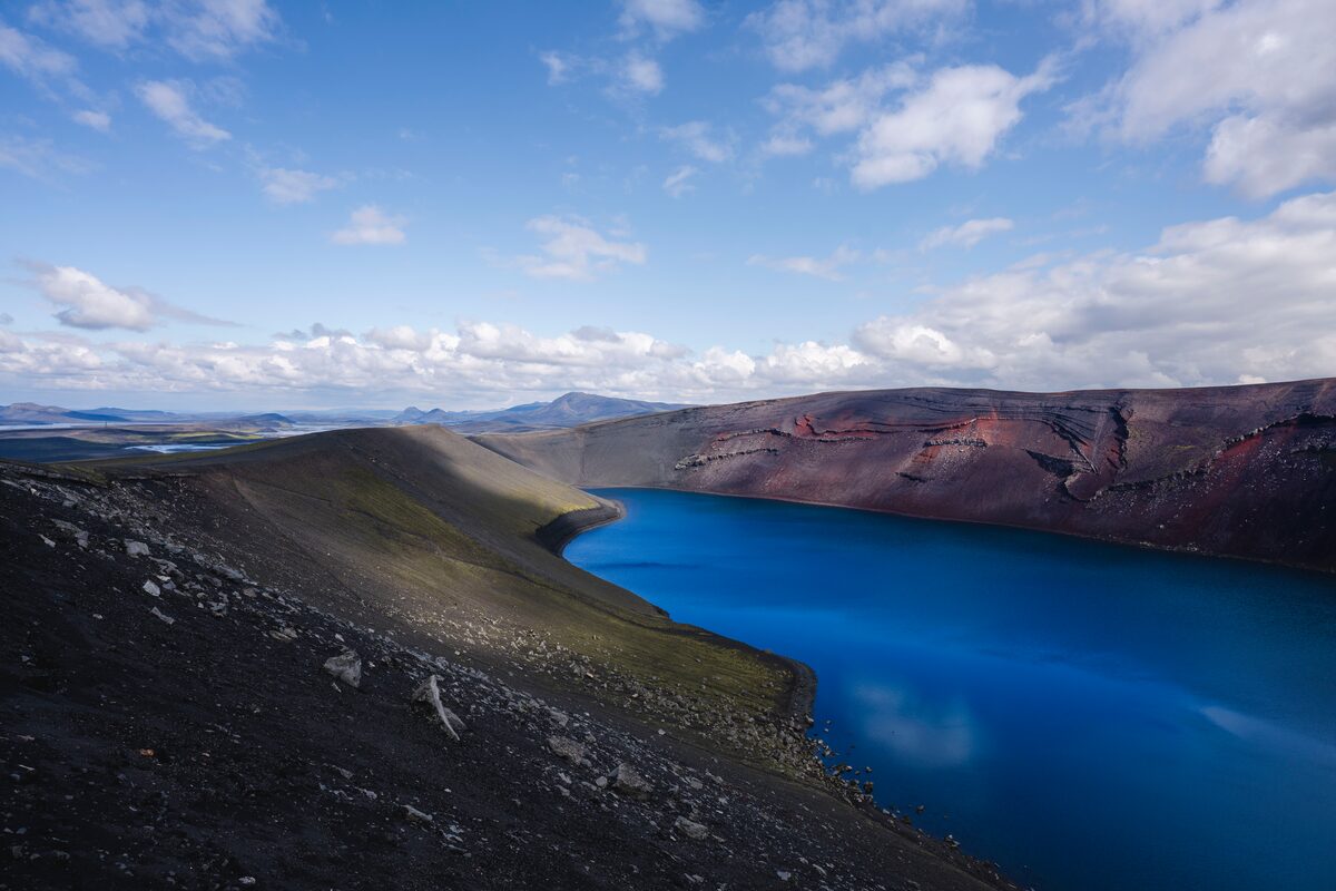 Ce circuit comprend trois jours fabuleux de trekking. Marchez au bord du magnifique lac Frostastaðavatn et visitez Ljótipollur, un cratère volcanique rouge d’une beauté incroyable rempli d’eau bleu vif. Le nom Ljótipollur signifie « mare de boue laide », il semble donc que celui qui l’a nommé avait un sens de l’humour ! Admirez le magnifique volcan, le Mont Brennisteinsalda, souvent considéré comme la montagne la plus colorée d’Islande. Près de la base de cette montagne, vous verrez des nuages surréalistes de vapeur s’échapper des fentes géothermiques. Au cours de ce trek, vous aurez également la chance d’atteindre le sommet de Suðuhuhámur, une autre montagne de rhyolite colorée et étonnante. Vous serez surpris par la beauté saisissante du canyon de Vondugil au bord du champ de lave de Laugahraun. Le sommet du Bláhnúkur offre une vue panoramique sur la région géothermique de Landmannalaugar. Bláhnúkur signifie ´le Pic Bleu’, cette montagne volcanique bleu-vert a été formée il y a environ 60 000 ans. Pour plus de détails sur les points forts de ce circuit, veuillez consulter l’itinéraire.