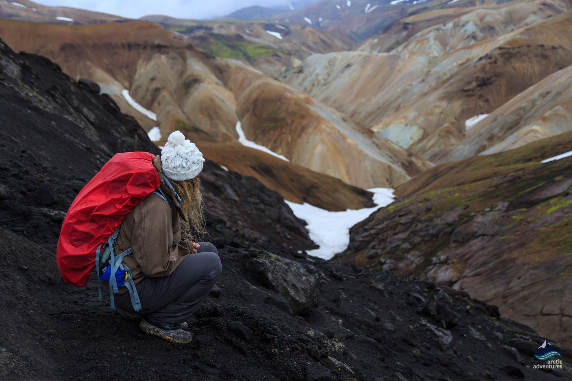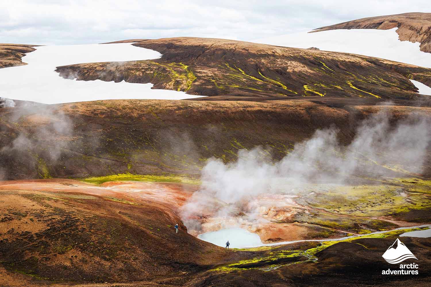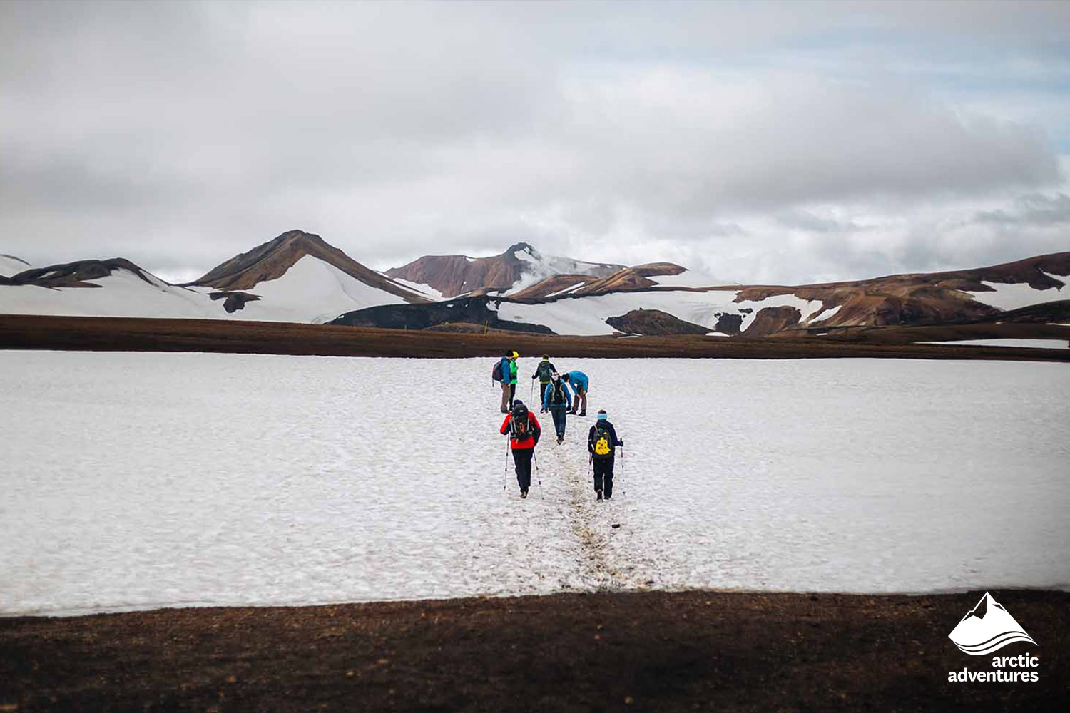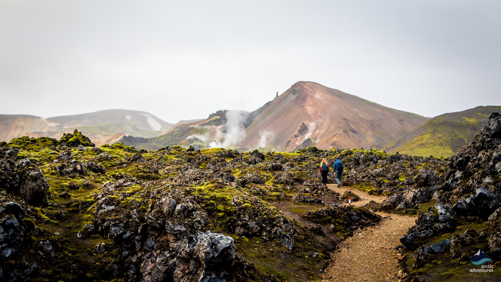 En route vers Hrafntinnusker où nous passerons la première nuit, nous verrons la source chaude Stórihver (qui signifie grande source) avant de traverser dans le désert d'obsidienne, la noirceur du corbeau de cette région a inspiré son nom, Hrafntinnusker, en islandais Hrafn signifie corbeau. Le refuge Hrafntinnusker, où nous passerons la nuit, se trouve dans une région très isolée d'une beauté naturelle exceptionnelle.