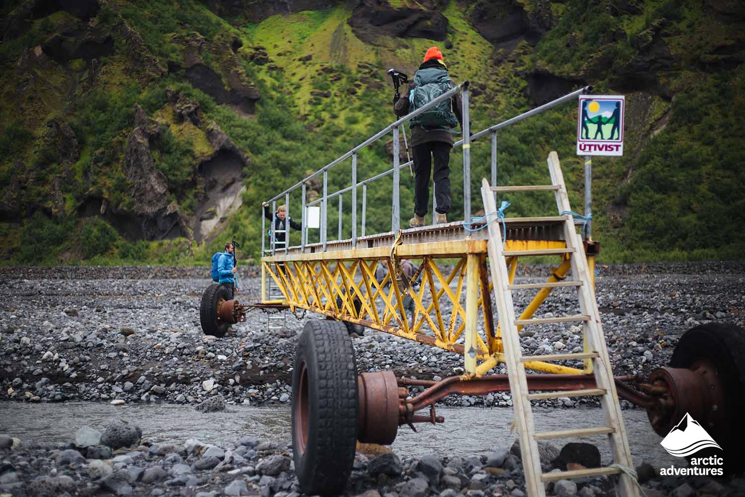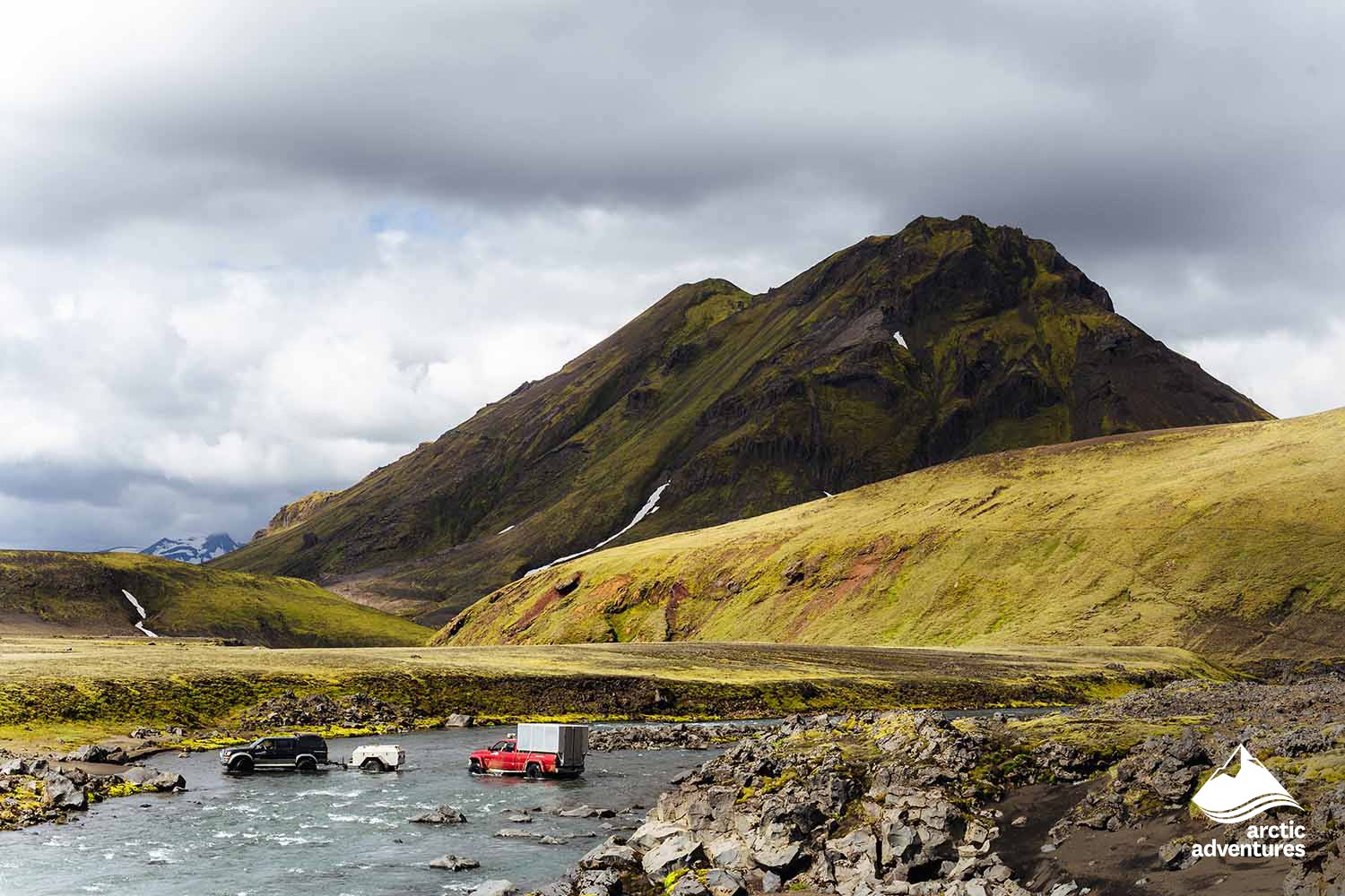 Les montagnes rhyolitiques de Reykjafjöll aux couleurs vives et la région de Jökultungur sont à l’ordre du jour. L’activité géothermique a transformé ces rigoles escarpées en brûlis, et parfois en jaunes et rouges vifs avec le temps, ces couleurs contrastant singulièrement avec les doux pics de sable clair qui les entourent. Le sommet de Jökultungur est un endroit merveilleux pour profiter d’une vue magnifique sur toute la région de Fjallabak (derrière la montagne) et Álftavatn, le lac près de la cabane de montagne où nous serons logés pour la nuit. Pour s’y rendre, nous devons traverser une rivière à pied, c’est généralement une expérience très excitante pour les randonneurs d’outre-mer qui n’ont généralement jamais essayé cette activité.