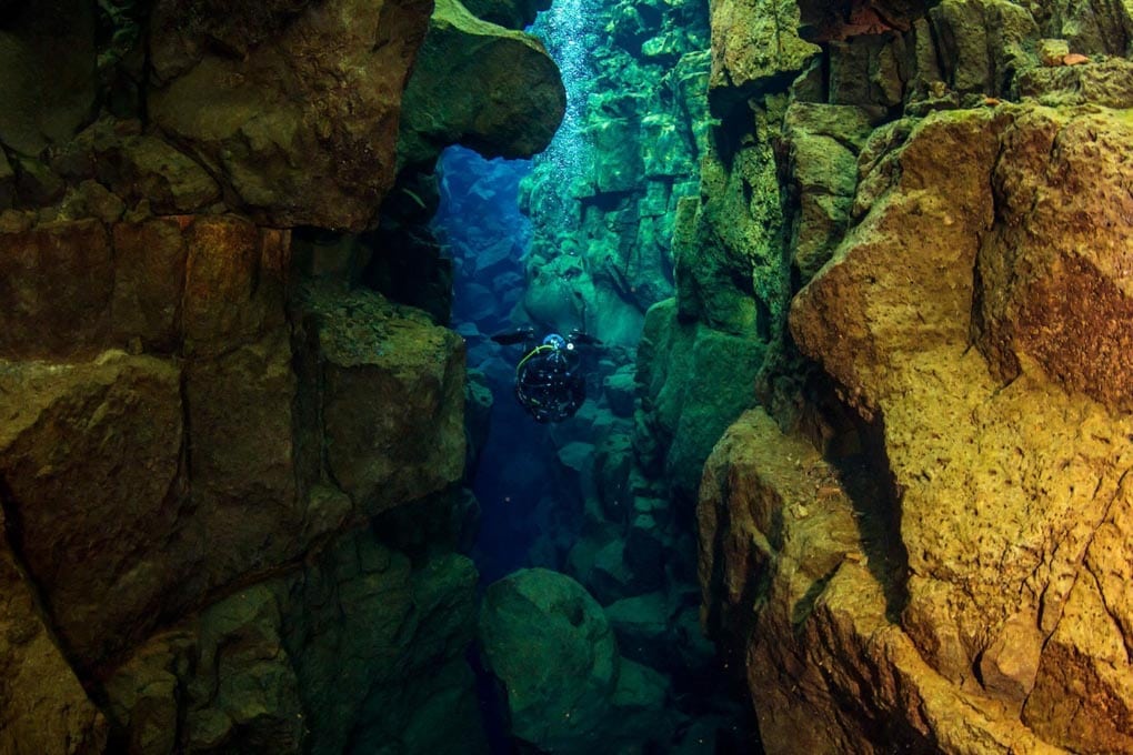 La faille de Silfra en Islande est devenue véritablement connue ces dernières années. Les plongeurs s’accordent à dire que c’est l’un des meilleurs spots de plongée en eau douce au monde. L’eau du glacier Langjökull, qui a été filtrée à travers le champ de lave au cours de son long voyage de 50 ans vers la fissure, est si claire que la visibilité est d’environ 100 mètres. Silfra est divisé en quatre sections principales que nous explorerons au cours de l’excursion. L’eau à Silfra est à une température constante de 2-4°C tout au long de l’année, mais toutes les saisons ont leur charme sous la surface. Silfra est situé au cœur du Parc National de Þingvellir, lieu fondateur du plus ancien parlement du monde et site répertorié au patrimoine mondial de l’UNESCO. Silfra présente un lieu d’un autre monde située dans un champ de lave directement au sommet de la vallée du rift continental entre l’Amérique et l’Europe.