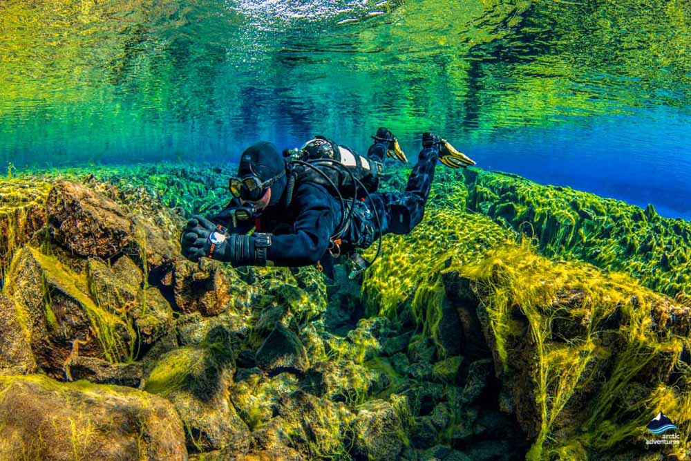 Généralement, on ne veut pas être entre un rocher et un endroit dur mais dans le cas de Silfra on ne veut rien de plus. Vivez l’apesanteur en flottant dans l’eau claire des glaciers entre les plaques tectoniques. Le faible courant entraîne un rythme parfait pour explorer cette belle région. La visibilité en eau douce est un phénomène inégalé, si profonde et si étendue qu’elle n’est parfois limitée que par la densité de l’eau elle-même. La profondeur varie de 10 à 40 mètres. Notre profondeur de plongée est limitée à 18 mètres par la réglementation du parc. C’est sans aucun doute l’une des meilleures spots de plongée subaquatique que le monde a à nous offrir. Si vous êtes un ou une passionné(e) de plongée, assurez-vous de ne pas la louper ! Sachez qu’il s’agit d’une plongée de niveau difficile où vous devez être capable de transporter de l’équipement lourd sur 400m.