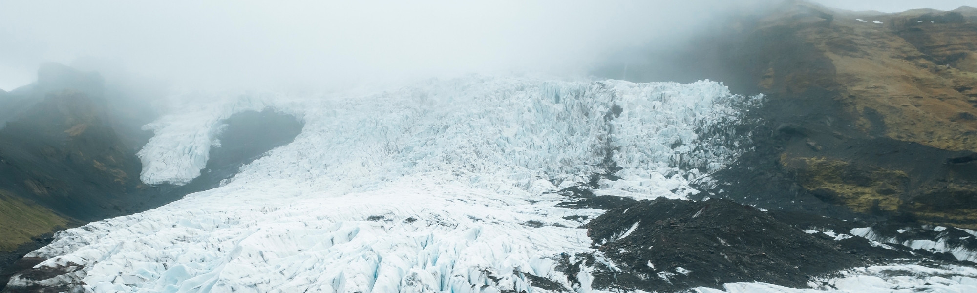 Svínafellsjökull Glacier: an explorable glacier outlet in the Skaftafell Nature Reserve. The landscape comprises black ash from the eruptions, white snow, and blue ice. The height allows you to enjoy panoramic views of the Icelandic interior.