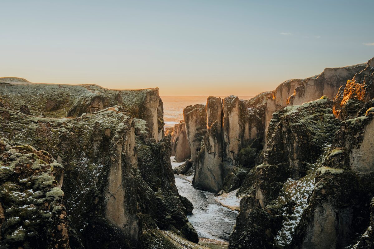 Fjaðrárgljúfur Canyon in winter is open for visitors to explore—and it’s absolutely gorgeous. The stream of the Fjaðrá River trickles peacefully while the hills accumulate snow, and the place truly looks like a scene out of a fantasy movie.