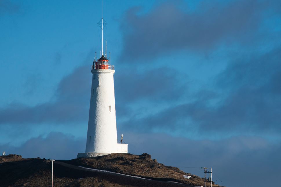 A blue sky with the white and orange Reykjanes Lighthouse in front