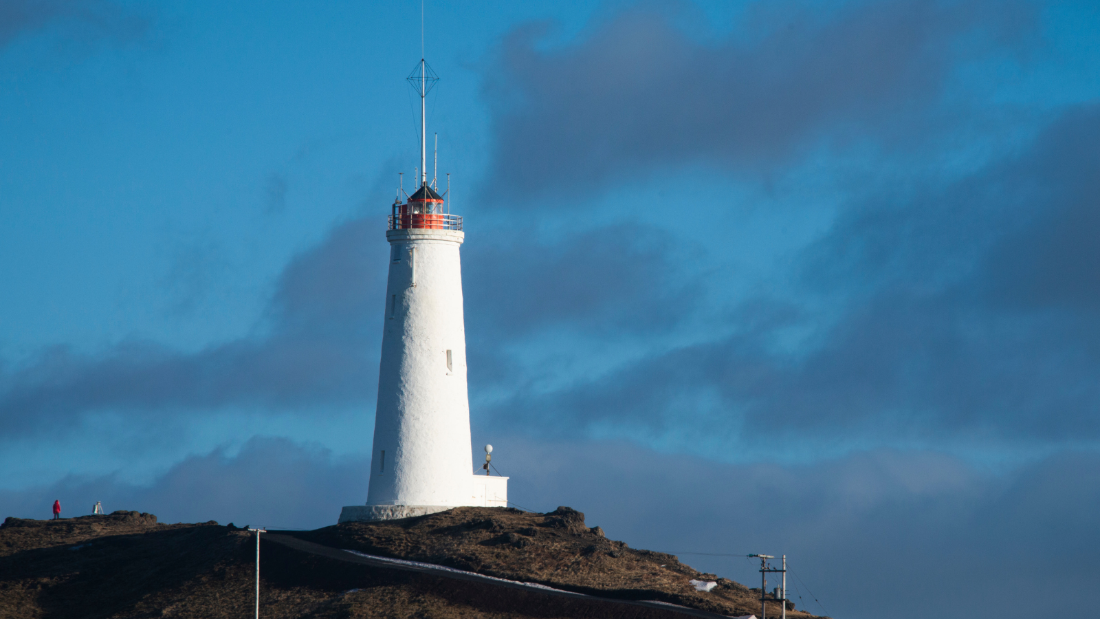A blue sky with the white and orange Reykjanes Lighthouse in front