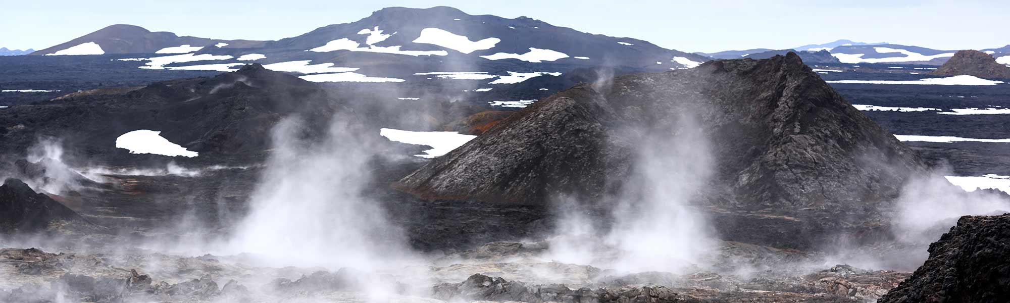 Krafla is a large volcanic system in North Iceland. The epicenter of the system is the Krafla caldera, an enormous explosion crater. The caldera is surrounded by a surreal landscape of bubbling mud pots and fumaroles.