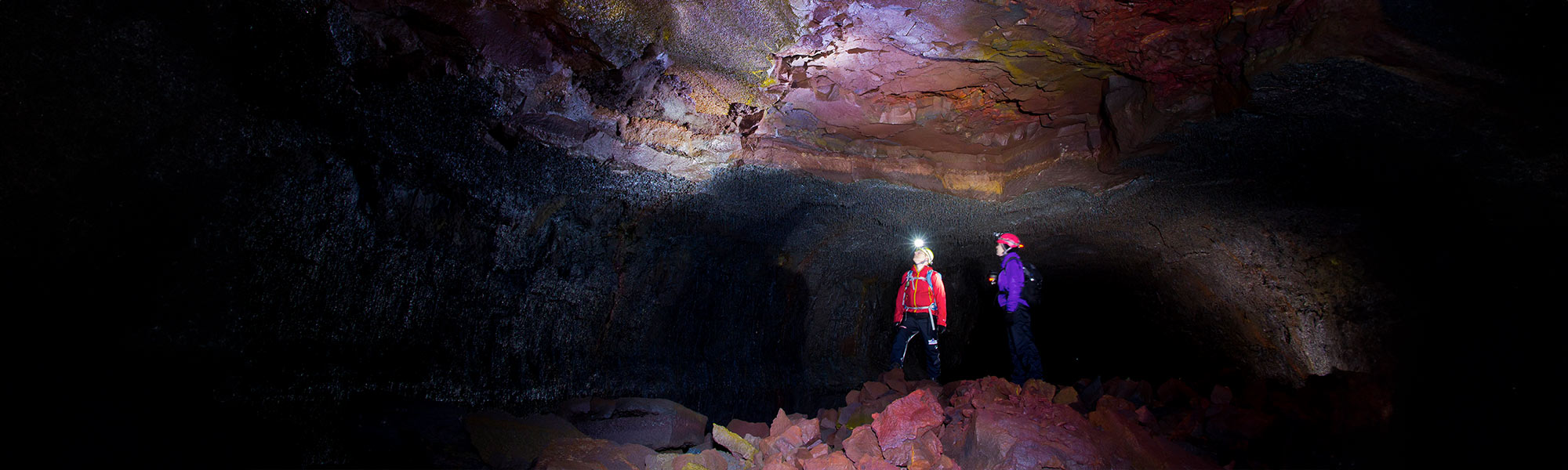 Viðgelmir is one of Iceland’s most popular lava caving spots. On a guided tour, you’ll see cave walls in stunning shades of ruby, turquoise, amber, and magenta. All around you, dramatic stalagmites and stalactites hang from the ceiling and rise from the floor. Ice sculptures form on the walls in winter, adding an extra layer of beauty to the scene.